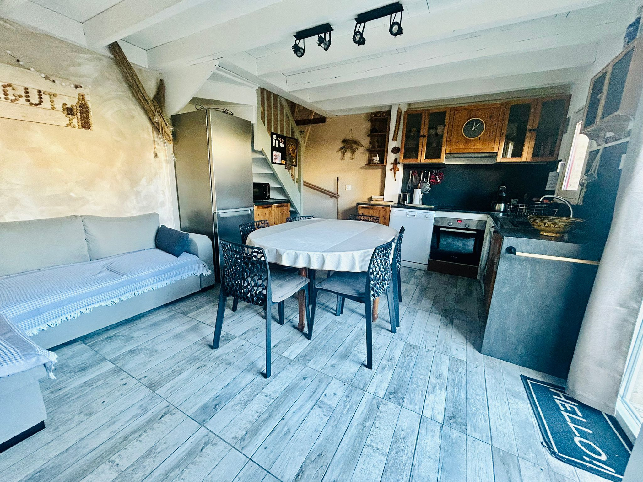 LOCATION SAISONNIÈRE Le Barcarès quartier du Village, Jolie maison en triplex, composée d’une cour d’environ 25m2. Au 1er étage : salon séjour, cuisine ouverte entièrement équipée (machine à laver, lave vaisselle), deux chambres une salle d’eau et un WC séparé, au 2ème étage une chambre. Idéale pour passer des vacances en famille ou entre amis à quelques mètres des commodités (commerces, banque, centre médical ouvert à l’année, Super U, place du marché), la plage et ses animations ainsi que la place du village est à 300 Mètres à pieds. Vous disposez d’un parking fermé sécurisé avec une place de parking non nominative. Le logement est équipé de la WIFI pour votre confort. 8 minutes à pied de la plage ! Tarifs à la nuit ou à la semaine :